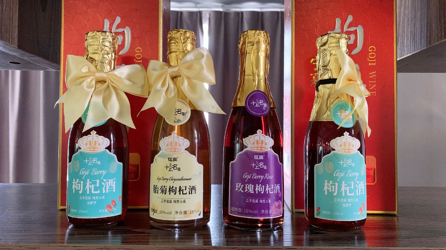 图为不同口味的枸杞酒,瓶身系上蝴蝶结非常可爱。(日本头条凉子摄)