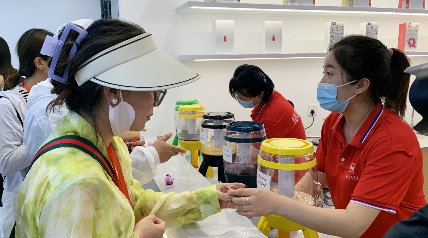 枸杞加工工厂有试吃、试喝环节,可以尽情品尝新鲜的枸杞原浆。除了常见的红色枸杞,还有黑枸杞原浆、沙棘原浆等。(日本头条凉子摄)