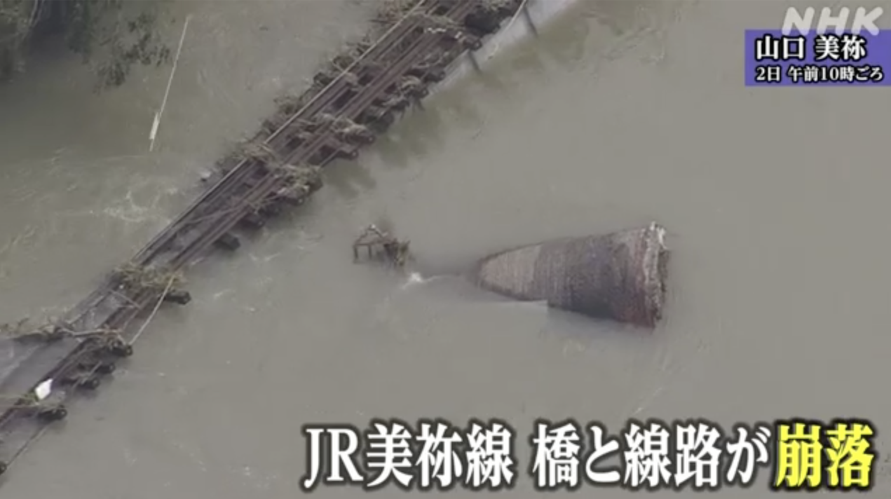 (日本头条讯)在山口县美祢市行驶的JR美祢线,由于创纪录的大雨桥和线路发生坍塌,恢复时期未定。