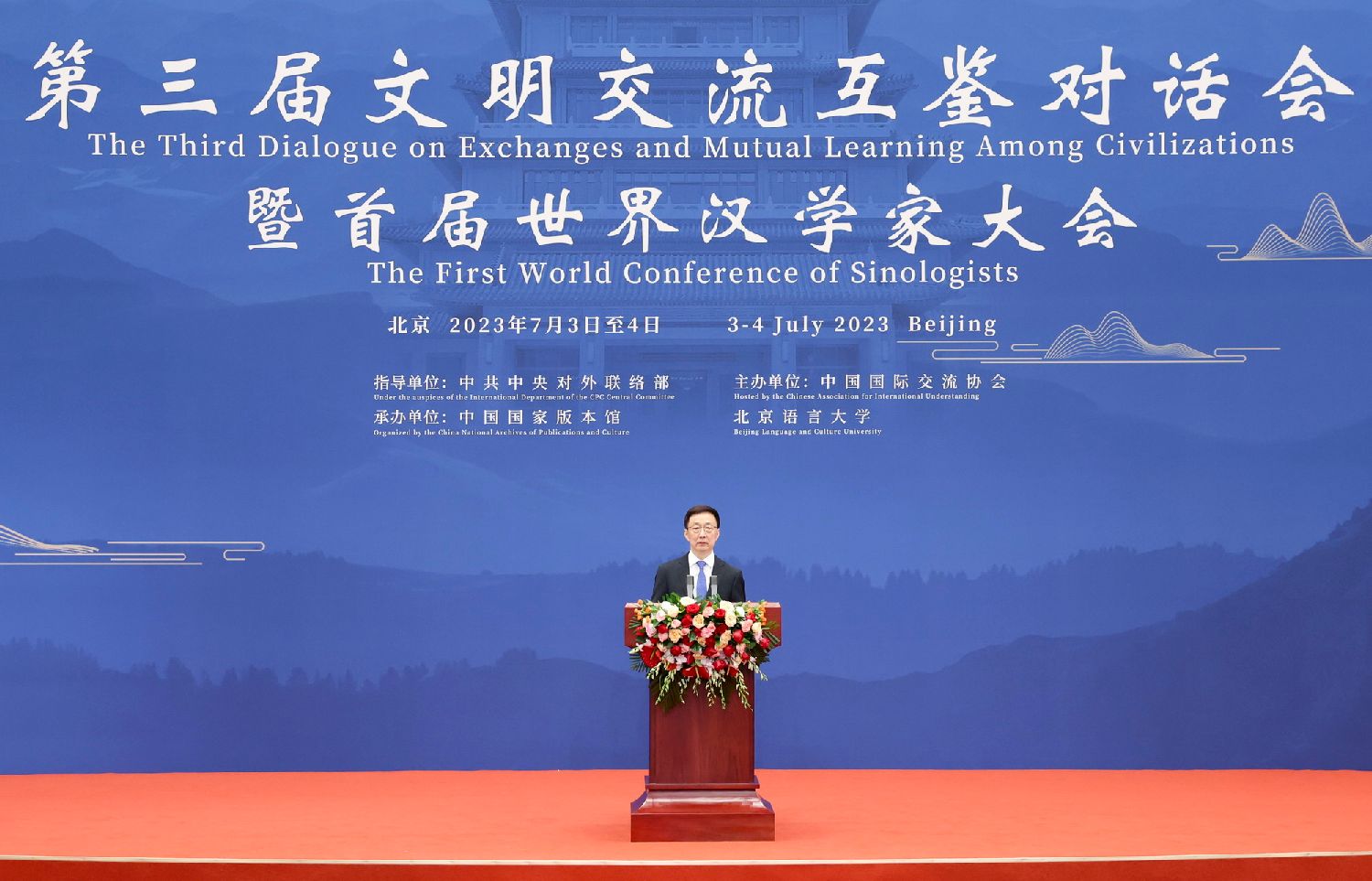7月3日,第三届文明交流互鉴对话会暨首届世界汉学家大会开幕式在北京举行,会上宣读了习近平主席贺信。中国国家副主席韩正出席并致辞。(图/新华社)