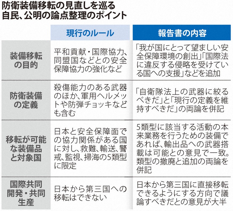 对此,自民党方面表示称,如果取消这五种类型,即使有杀伤性的武器也能增加出口数量,而这将加强与其他国家的关系。而公明党方面则由于考虑到不应助长冲突,且历史上也没有批准过类似的出口为由持保守立场。