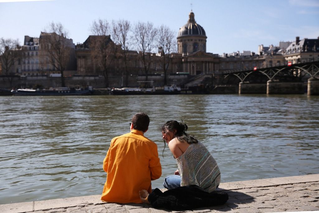 图为一对男女在巴黎塞纳河畔晒太阳。(图/新华社)
