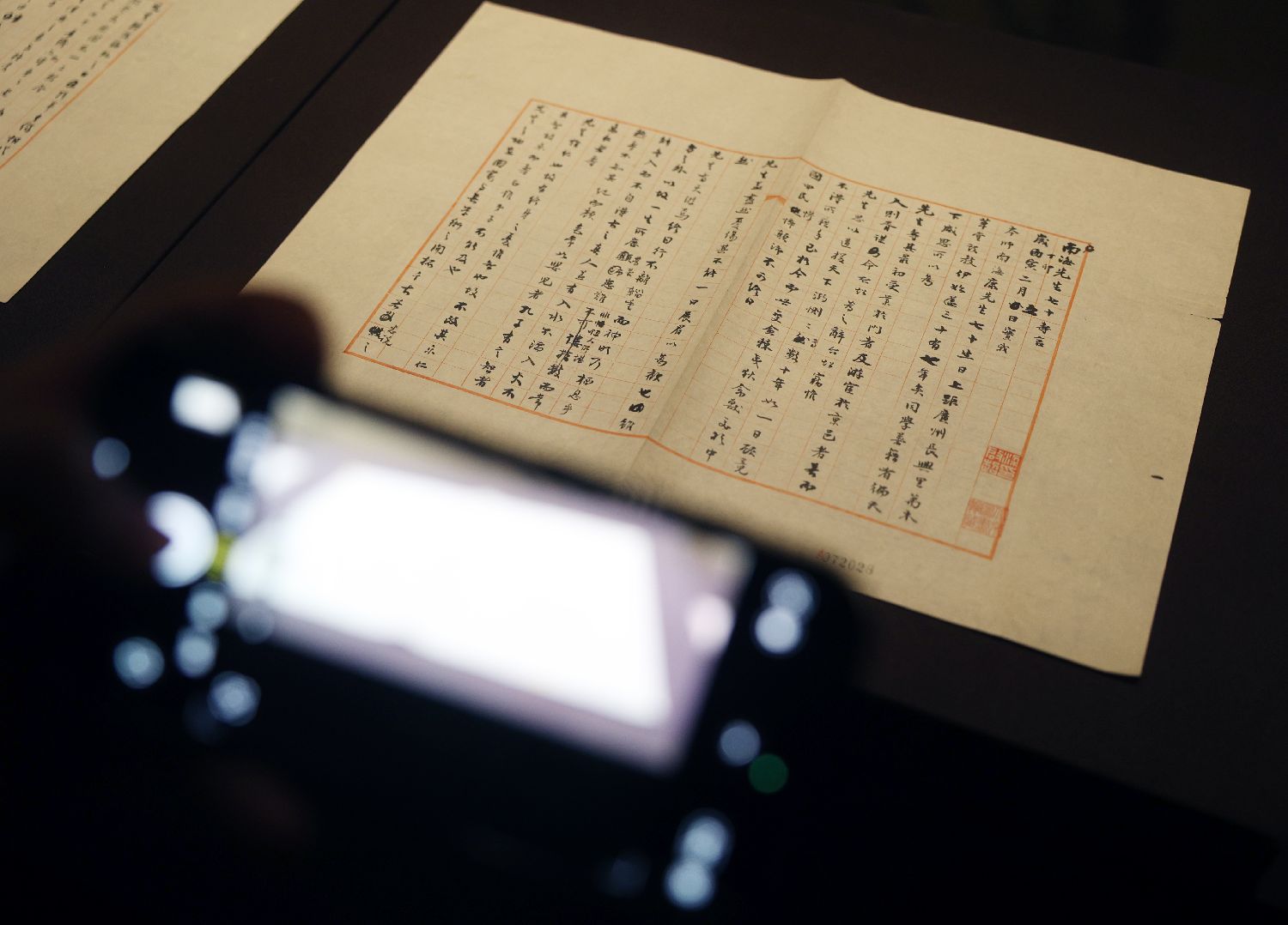 7月14日,梁启超手稿《南海先生七十寿言》吸引参观者拍摄。据介绍,1927年3月8日是康有为七十大寿,梁启超先生特撰《南海先生七十寿言》一文,衷情诉说当年康有为对他思想的影响,后又亲自将其抄录在16幅寿屏上,文章“情文并茂,传通一时”。(黎明 摄)