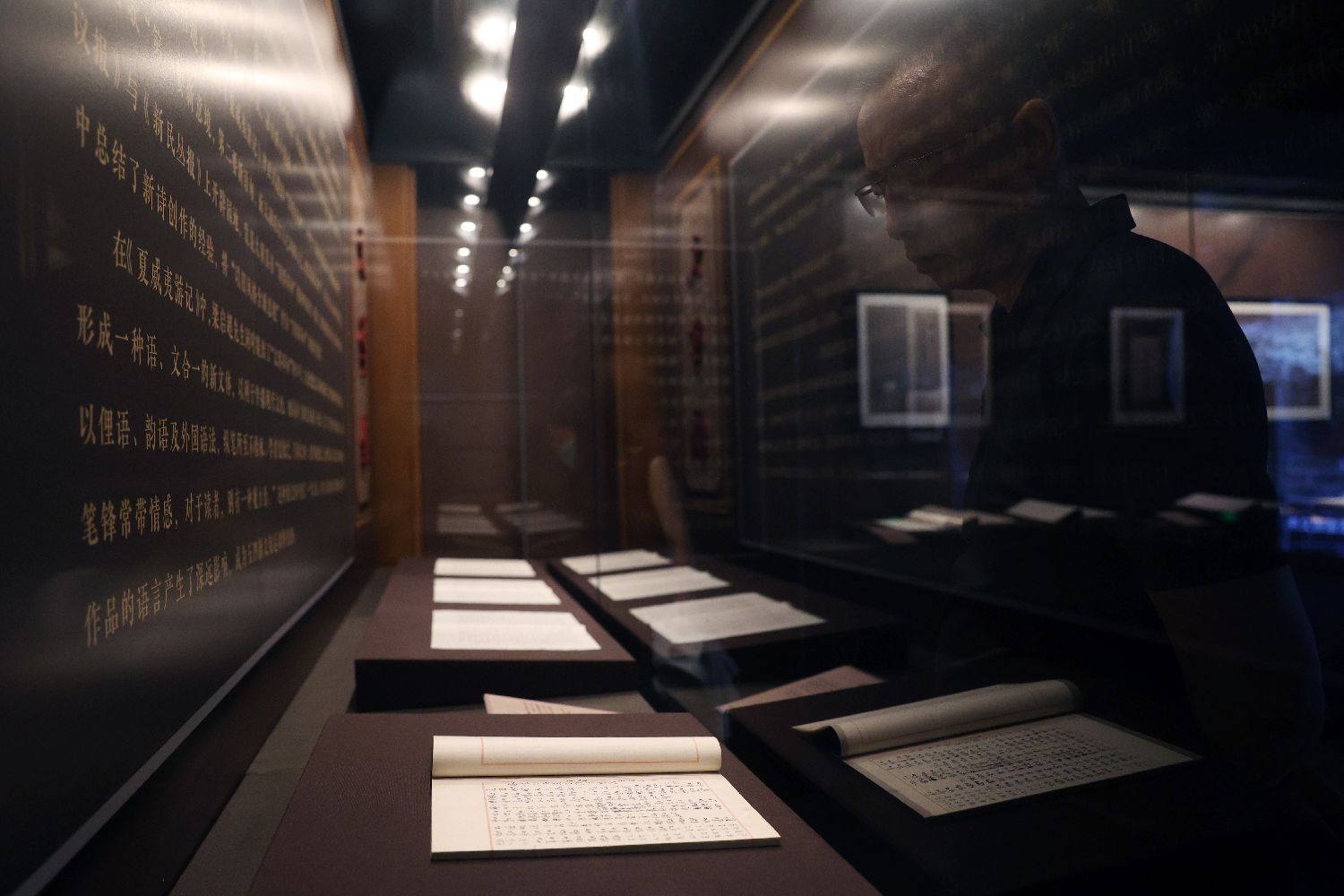 7月14日,参观者在展厅内欣赏展出的梁启超《饮冰室合集》文稿。 (黎明 摄)