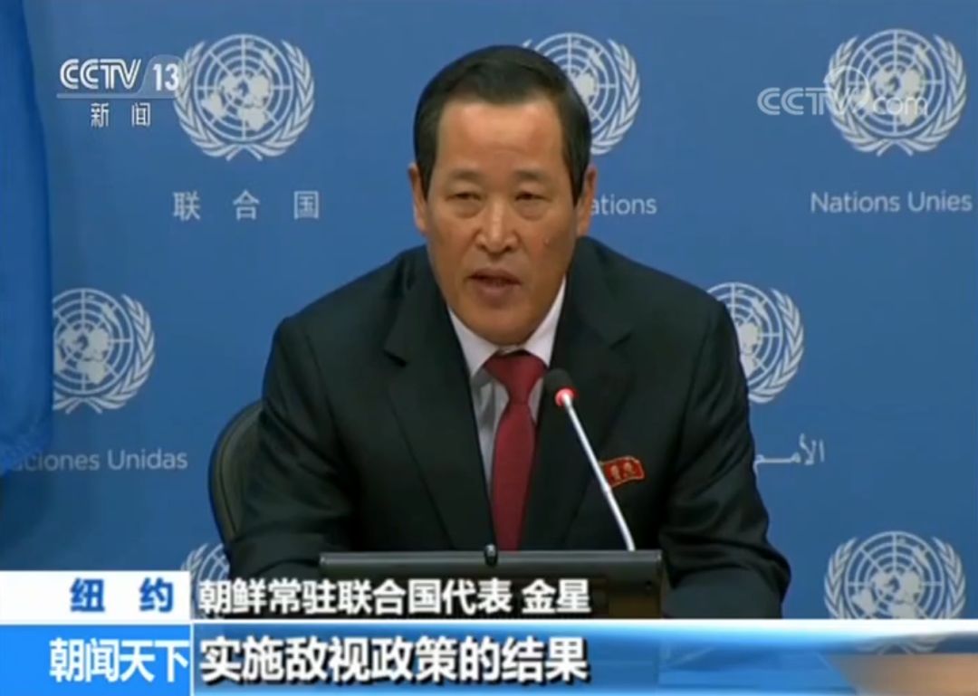 朝鲜驻联合国代表金星在安理会上表示,“我们坚决反对并谴责美国及其追随者召开安理会简报会议”。(图/中国央视新闻视频截图)
