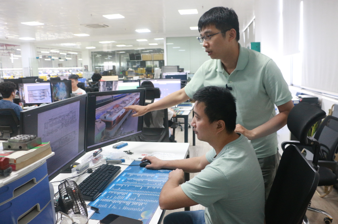 钟言(右)与同事商讨火车模型设计方案。(图/中新社)