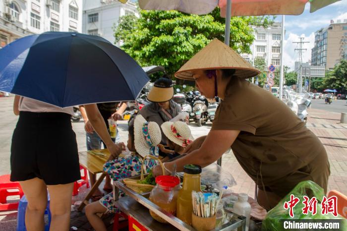 图为东兴口岸附近的一处小吃摊吸引游客。 翟李强摄