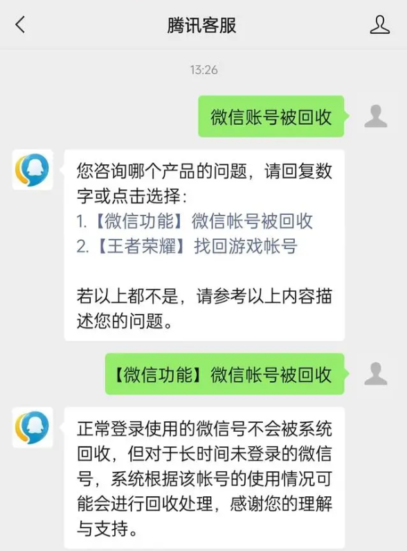 腾讯客服回复微信账号被回收。(图/微信截图)
