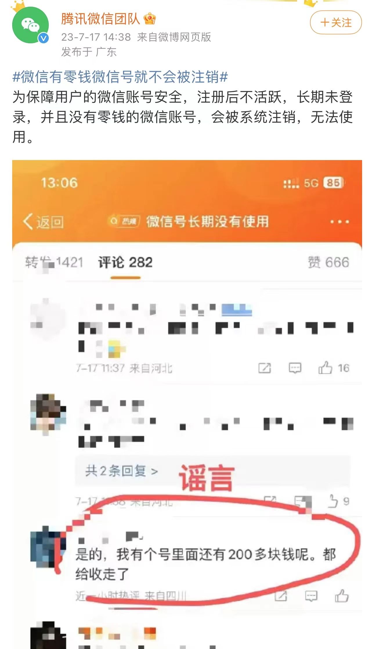 腾讯微信团队表示,微信有零钱微信号就不会被注销。(图/腾讯微信团队官方微博截图)