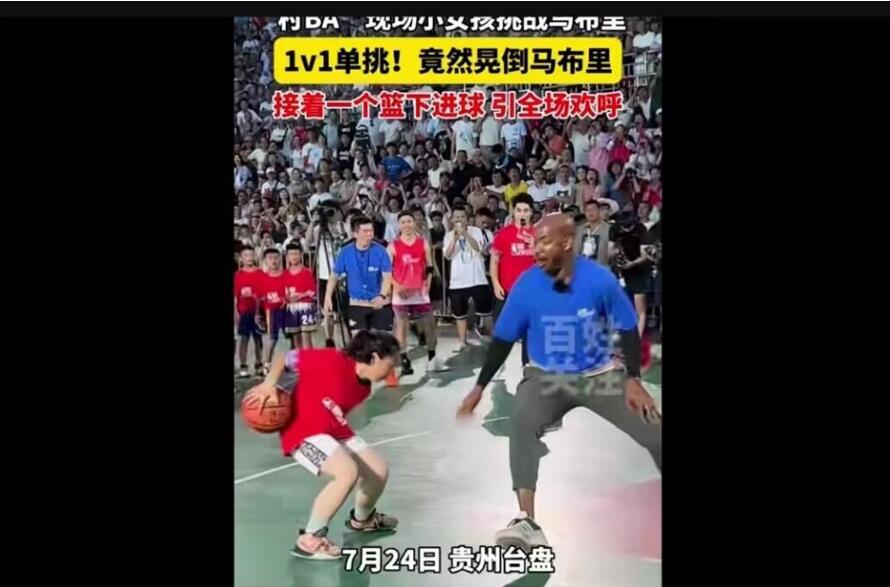 另据贵州广播电视台“百姓关注”栏目7月24日晚间报道,马布里在与当地小球员互动时,出了个“洋相”,被一名小球员给晃倒在地,那名小球员随后直接上空篮命中,赢得了球迷喝彩。