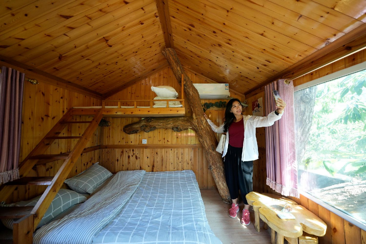 6月29日,游客在河北省迁西县汉儿庄镇一处民宿的房间内自拍。(图/新华社)
