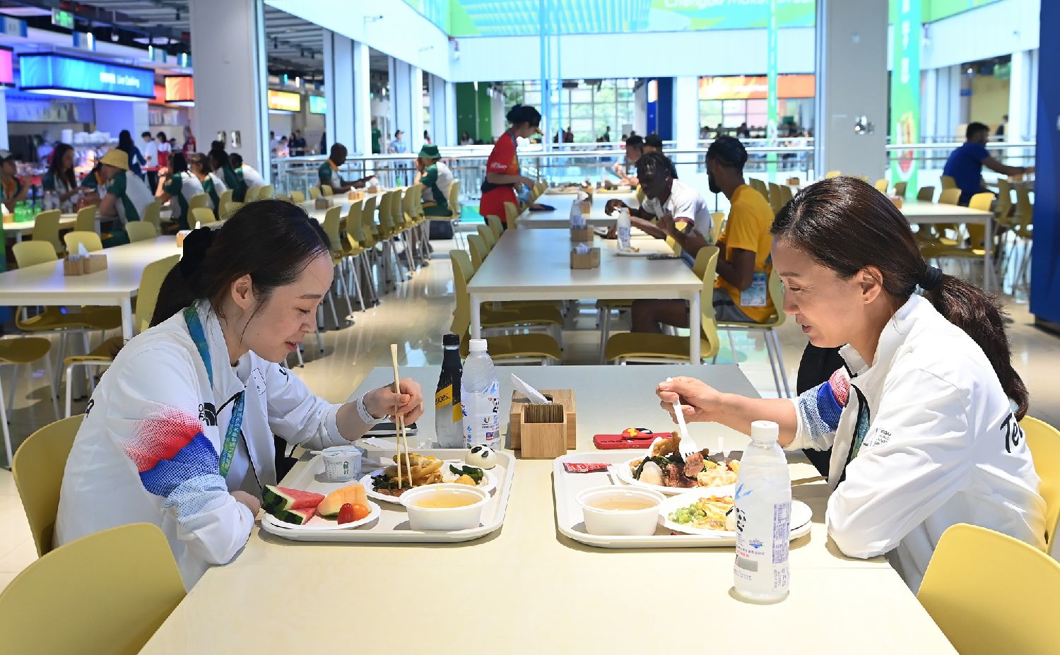 近日,运动员在位于四川成都的第31届世界大学生夏季运动会运动员村餐厅就餐。(图/中新社)
