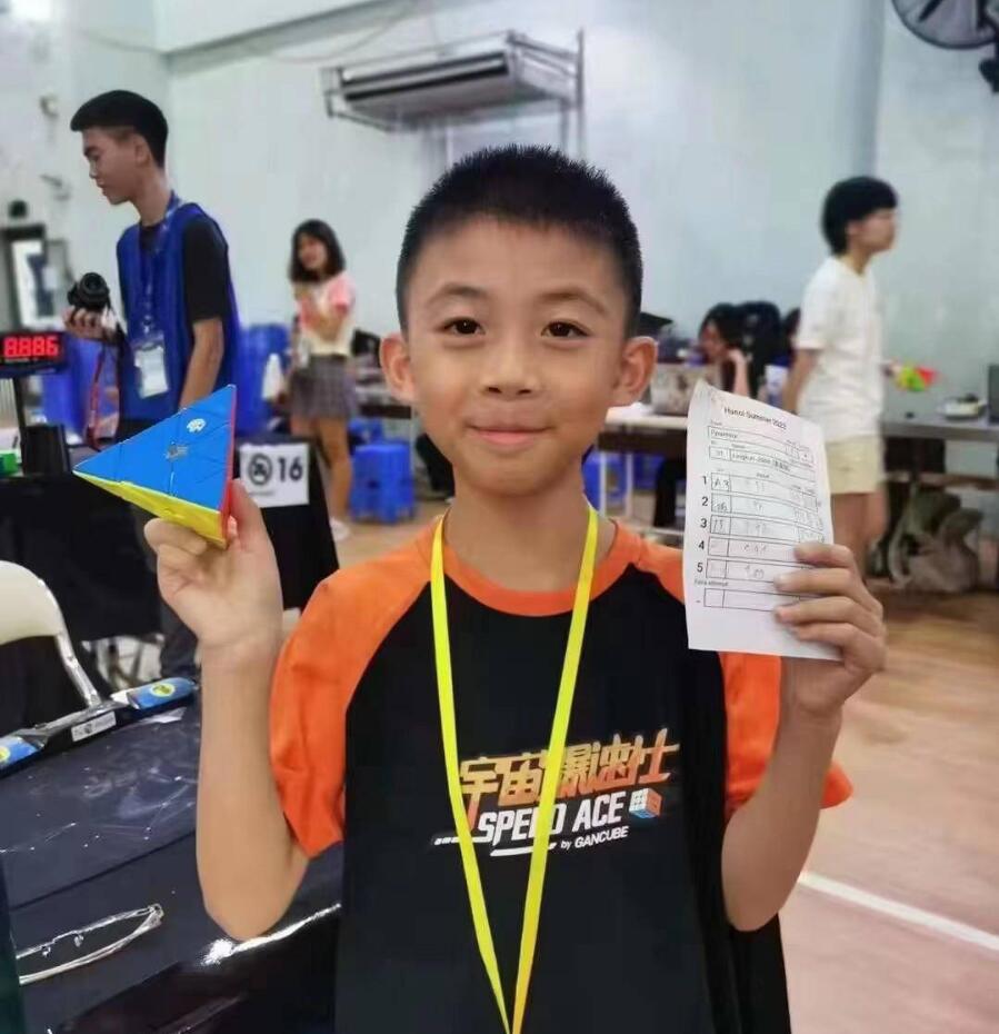 22日在越南河内举办的2023年WCA(世界魔方协会)魔方比赛中,丹阳市8岁参赛选手姜凌坤以1.7秒的平均成绩,成功打破魔方比赛金字塔项目亚洲纪录。(图/南京扬子晚报网)