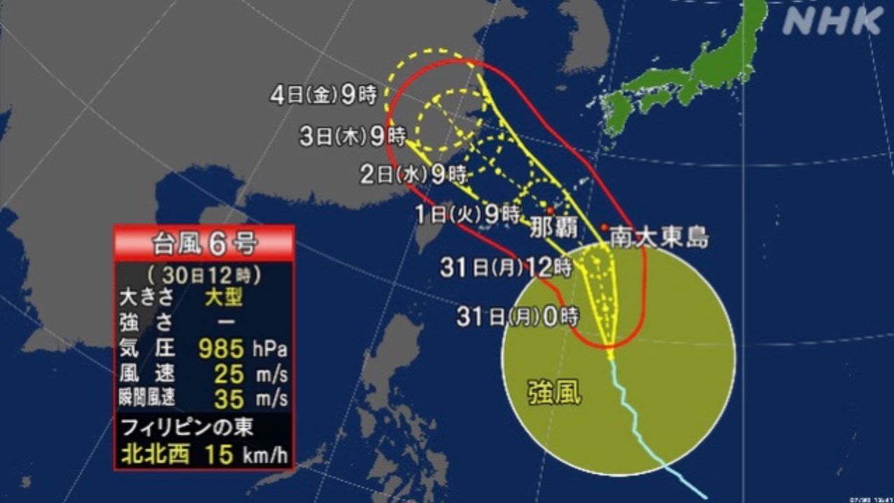 (日本头条讯)今年第6号台风已于今天凌晨加强为强热带风暴级,5时位于菲律宾马尼拉东偏北方向约1370公里的菲律宾以东洋面上(北纬18.3度、东经133.2度),中心附近最大风力有10级(28米/秒),中心最低气压为982百帕,七级风圈半径280~360公里,十级风圈半径40~90公里。