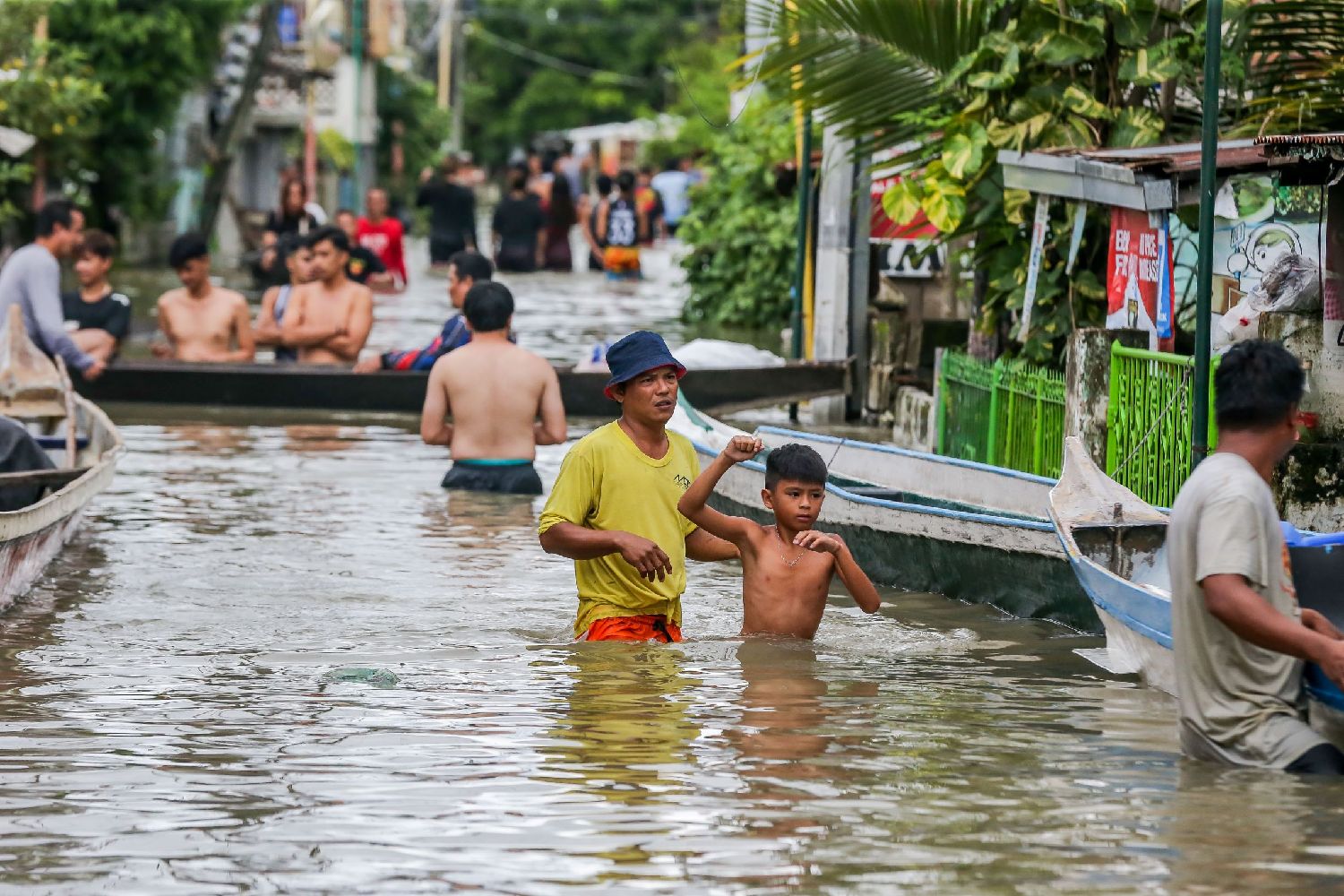 台风“杜苏芮”于7月26日相继在菲律宾卡加延省富加岛和达卢皮里岛登陆,带来强降雨。图为7月31日,在菲律宾布拉干省,人们涉水出行。(图/新华社)
