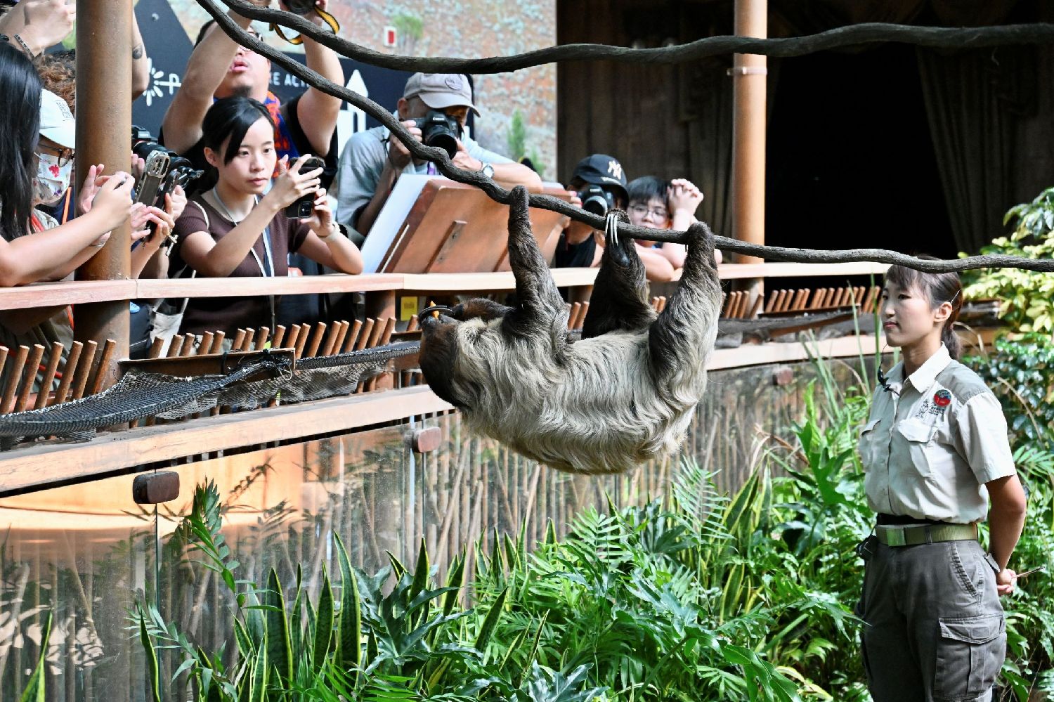 图为市民近距离观看二趾树懒。(图/中新社)