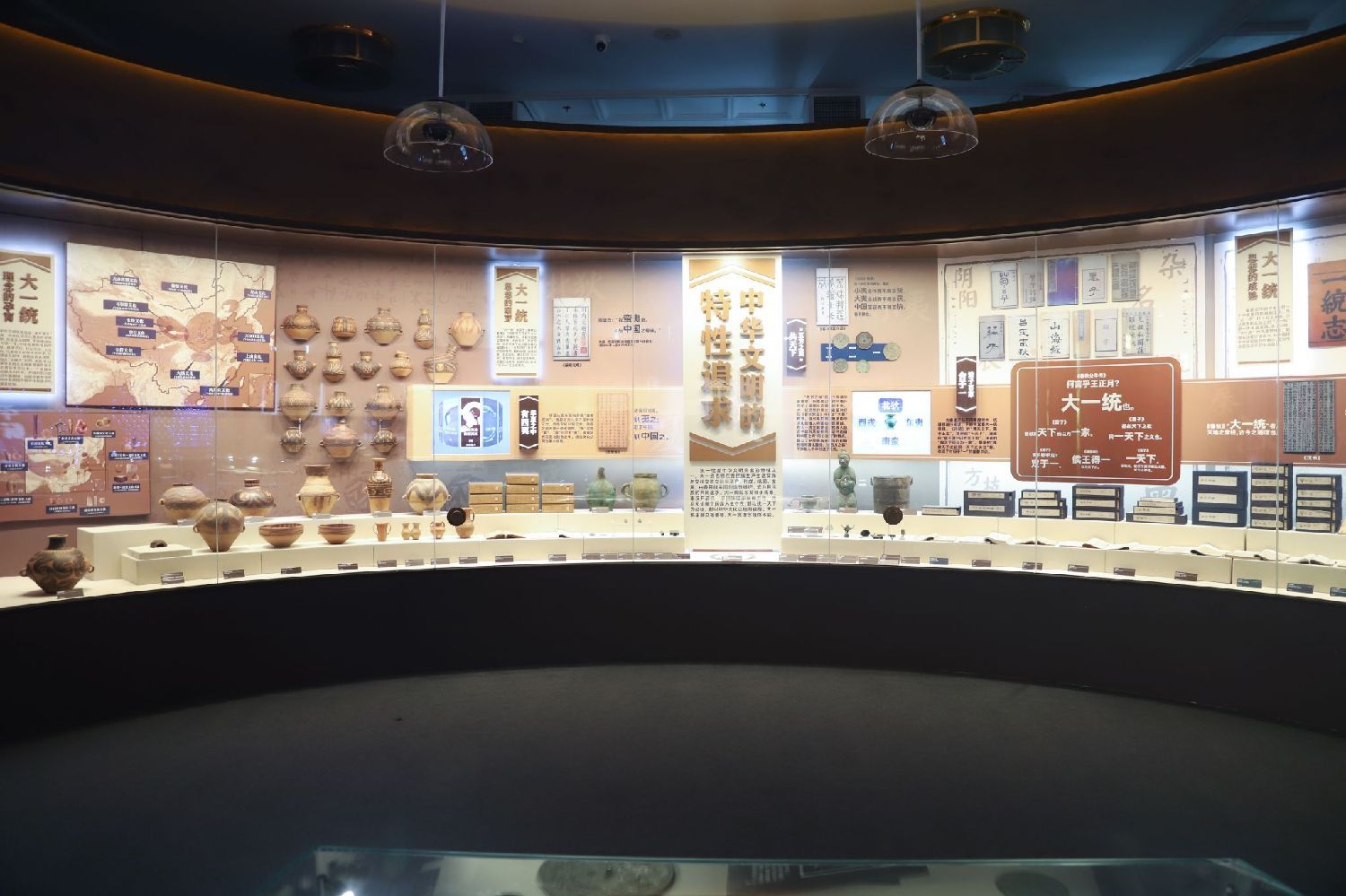 展览分为“大一统”“大交融”“大团结”三个单元。“大一统”单元从思想理念、制度实践、价值追求三个维度展现中华民族和中华文明延续不断的历史基因;“大交融”单元从文化上的兼收并蓄、经济上的相互依存、情感上的相互亲近三个方面,展现了中华民族在交往交流交融中发展壮大的脉络和凝聚不散的历史密码;“大团结”单元展现了中国共产党从成立至今一脉相承的中华民族大团结的深邃思想与丰富实践。