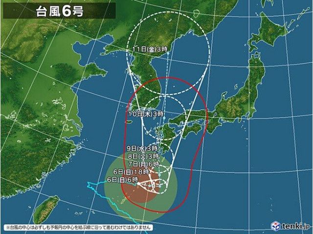 (日本头条讯)据日本气象厅称,台风6号将于6日下午4点在鹿儿岛县奄美市东南方80公里处缓慢向东移动。中心气压970百帕,中心附近最大风速30米,瞬间最大风速40米。