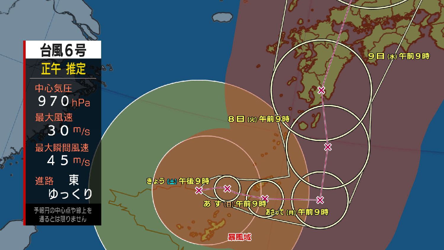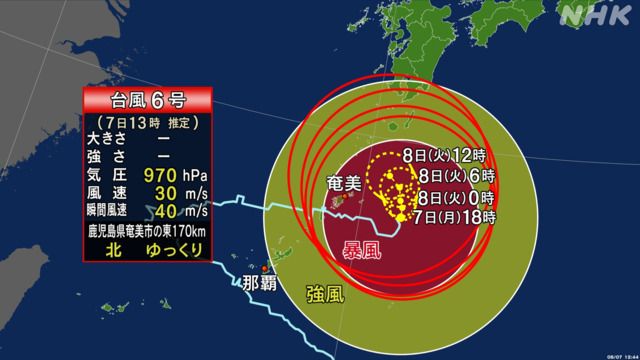 根据气象厅的消息,台风6号以缓慢的速度向北方向前进,目前位于鹿儿岛县奄美市以东160公里的海上。台风中心气压为970百帕斯卡,中心附近最大风速为30米/秒,最大瞬间风速为40米/秒,在中心半径220公里范围内,阵风风速达25米/秒以上。受台风影响,四国地区的雨势增强,截至上午10时,国土交通省在高知县佐川町设置的雨量计已观测到39毫米的强降雨。