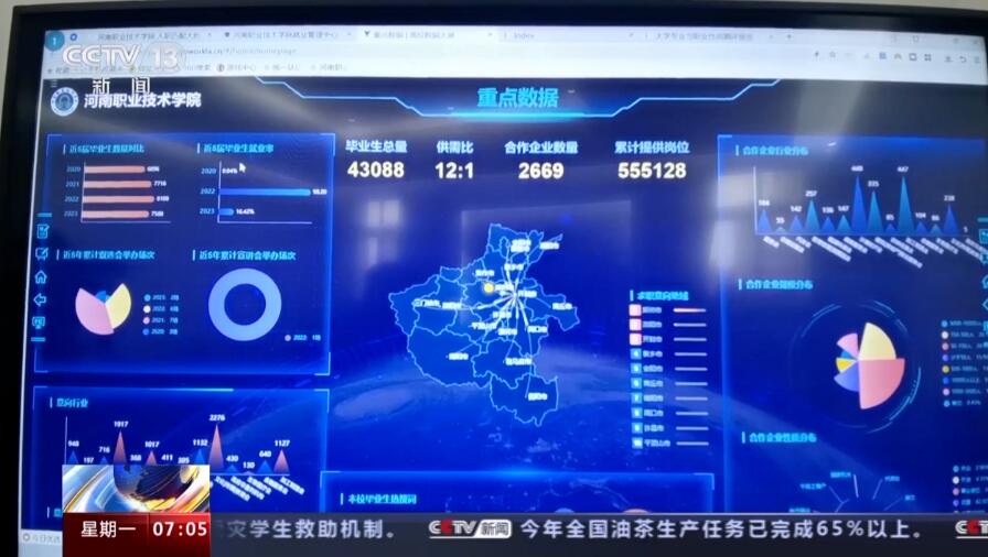 为了让人才培养和职业岗位能力要求更加适配,学校也在通过智慧化教育手段助力学生精准就业。河南职业技术学院是中国国家教育数字化战略行动的试点单位,借助大数据平台,学校在教学过程中,充分挖掘学生个性潜能,并进行“人职匹配”,为学生规划合适的就业出路。