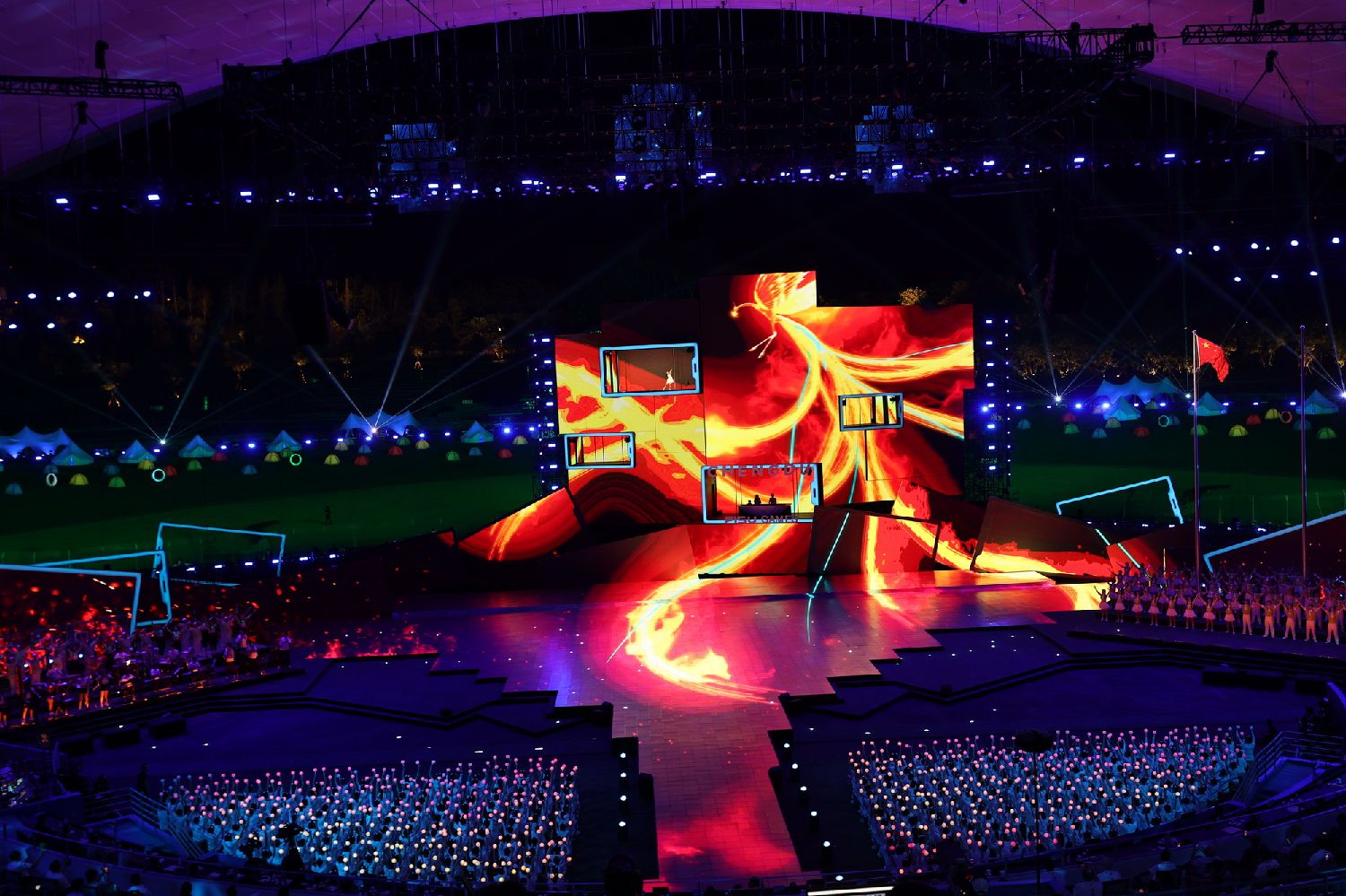 焰火在空中绽放出倒计时数字,全场观众随着数字齐声呼喊,“太阳神鸟”飞临闭幕式现场。成都大运会闭幕式正式开始。