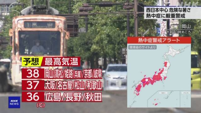 截至上午11时,名古屋市的最高气温为36.7℃,大阪府枚方市和静冈县浜松市为36.4℃,岐阜市为35.5℃,京都市为35.2℃。
