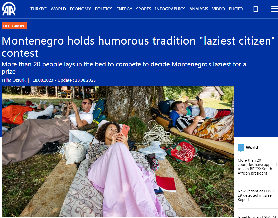 土耳其阿纳多卢通讯社报道,黑山于18日举办“懒人比赛”,21名参赛者保持躺卧姿势比拼卧床时长,获胜者将获得1000欧元的奖金和“最懒公民”的称号。