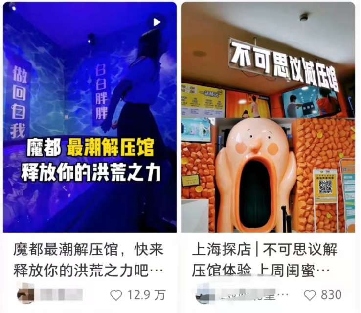 根据某点评网站的搜索结果,上海市内已有500多个相关场馆。某社交软件上已有过万篇解压馆“种草笔记”,最高点赞量破十万。