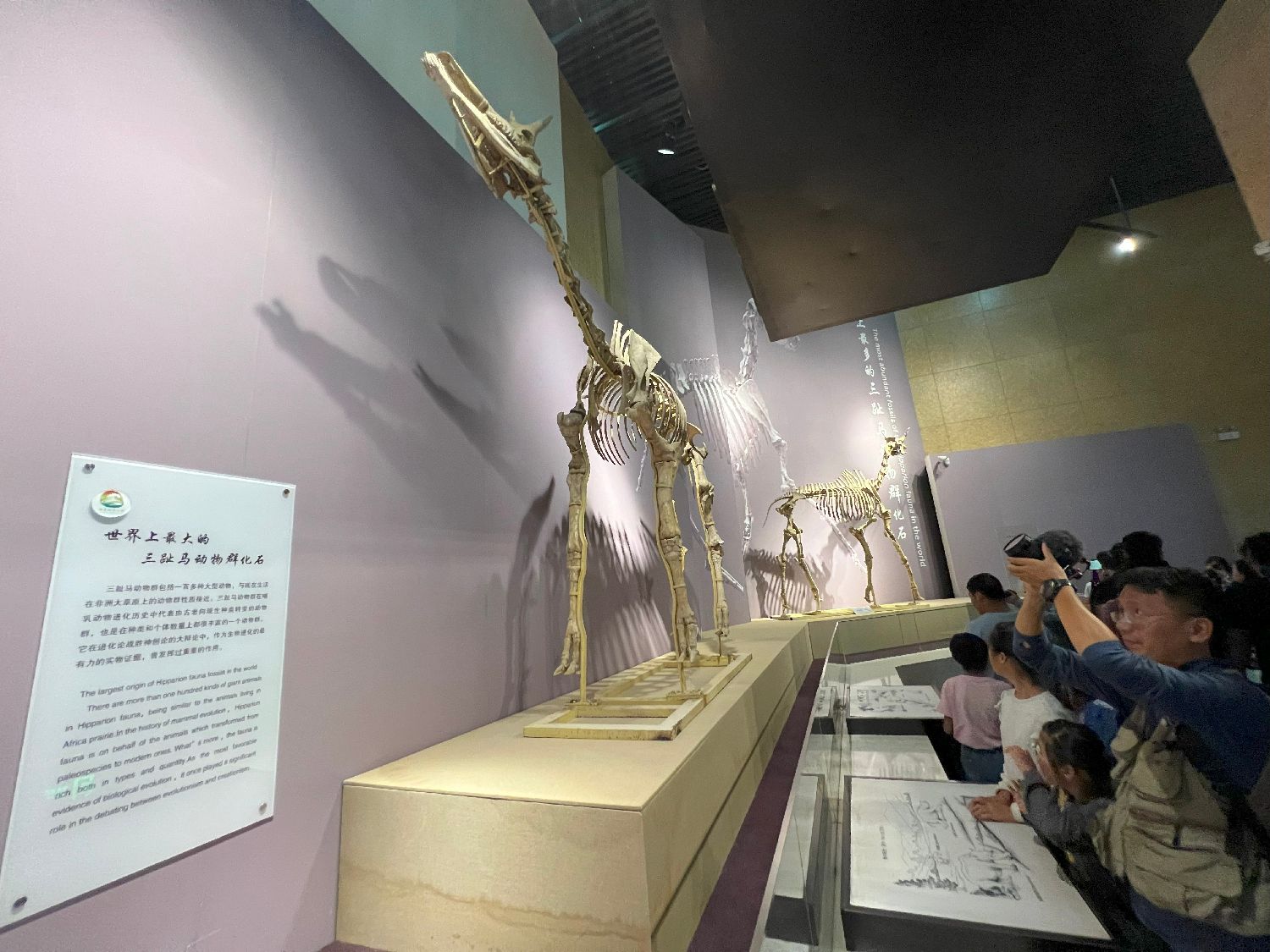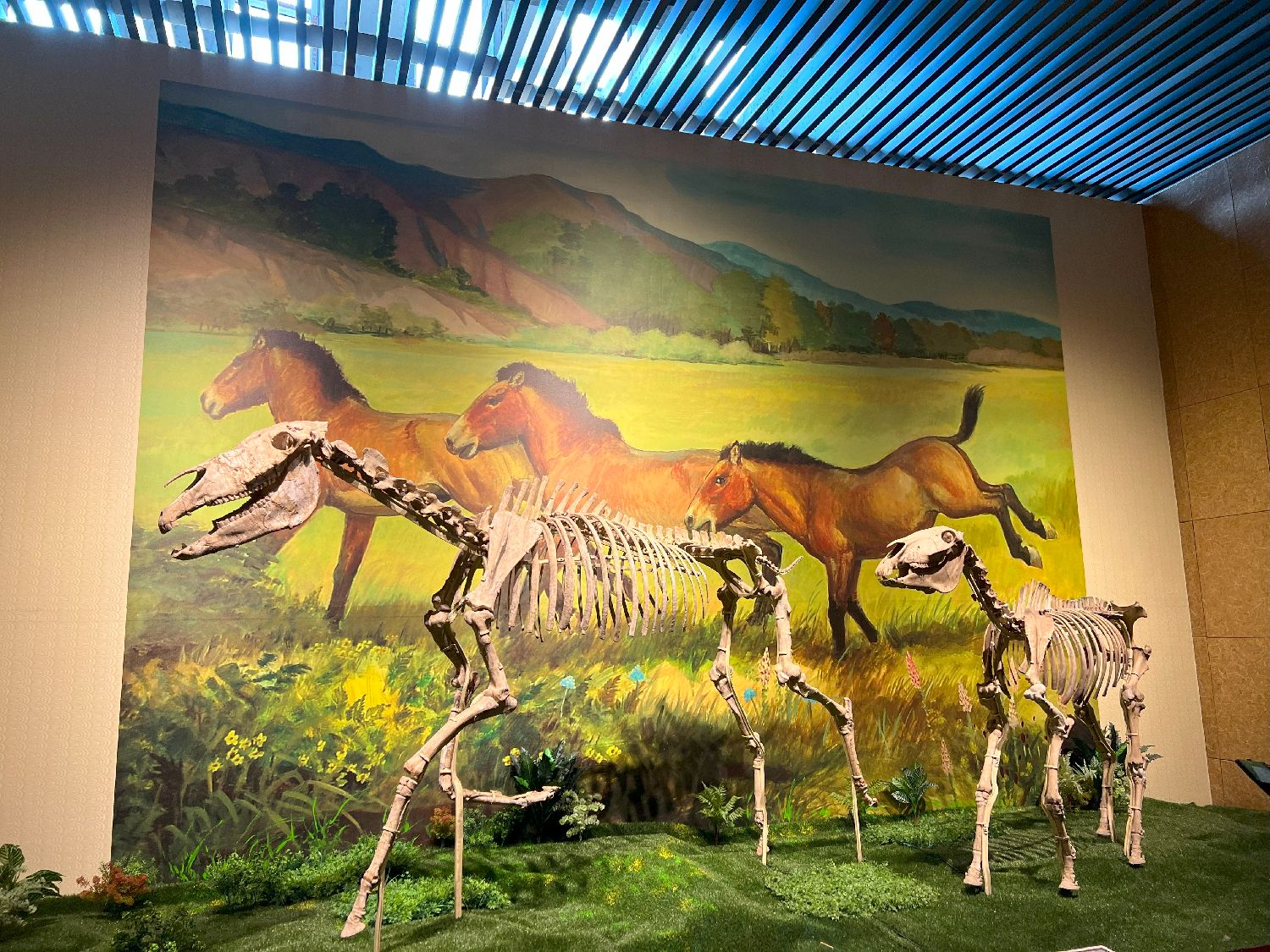 图为世界上脸最长的马——“埃氏马”复原骨架。埃氏马是中国科学院的研究人员在甘肃临夏盆地250万年前的更新世早期黄土地层中发现的一种新的真马化石,它被用法国知名研究化石古生物学家艾森曼的名字命名。埃氏马的头骨长度达到0.73米,同时它的脸部无论从绝对还是相对两个方面来说在马类中都是最长的。(江津 摄)