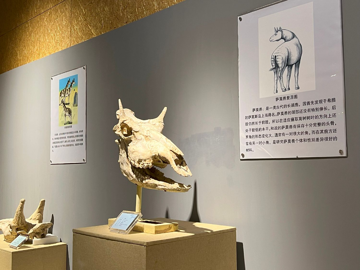 图为萨莫兽头骨化石。萨莫兽是一种古代长颈鹿,其角的形态变化大,通常有一对很大的角,而在其前方还常有另一对小角,是研究萨莫兽个体和性别差异很好的材料。(江津 摄)