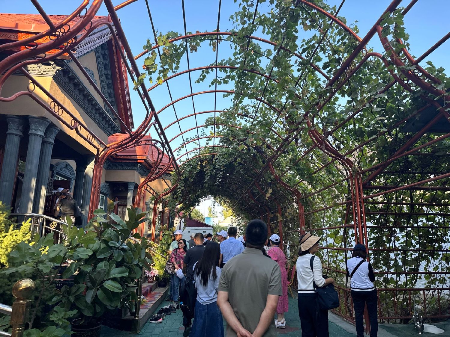 图为中国全国台联香港台胞新疆北京经贸文化参访团来到伊犁哈萨克自治州首府伊宁市喀赞其民俗旅游区内一户民居参访。(图/中新社)
