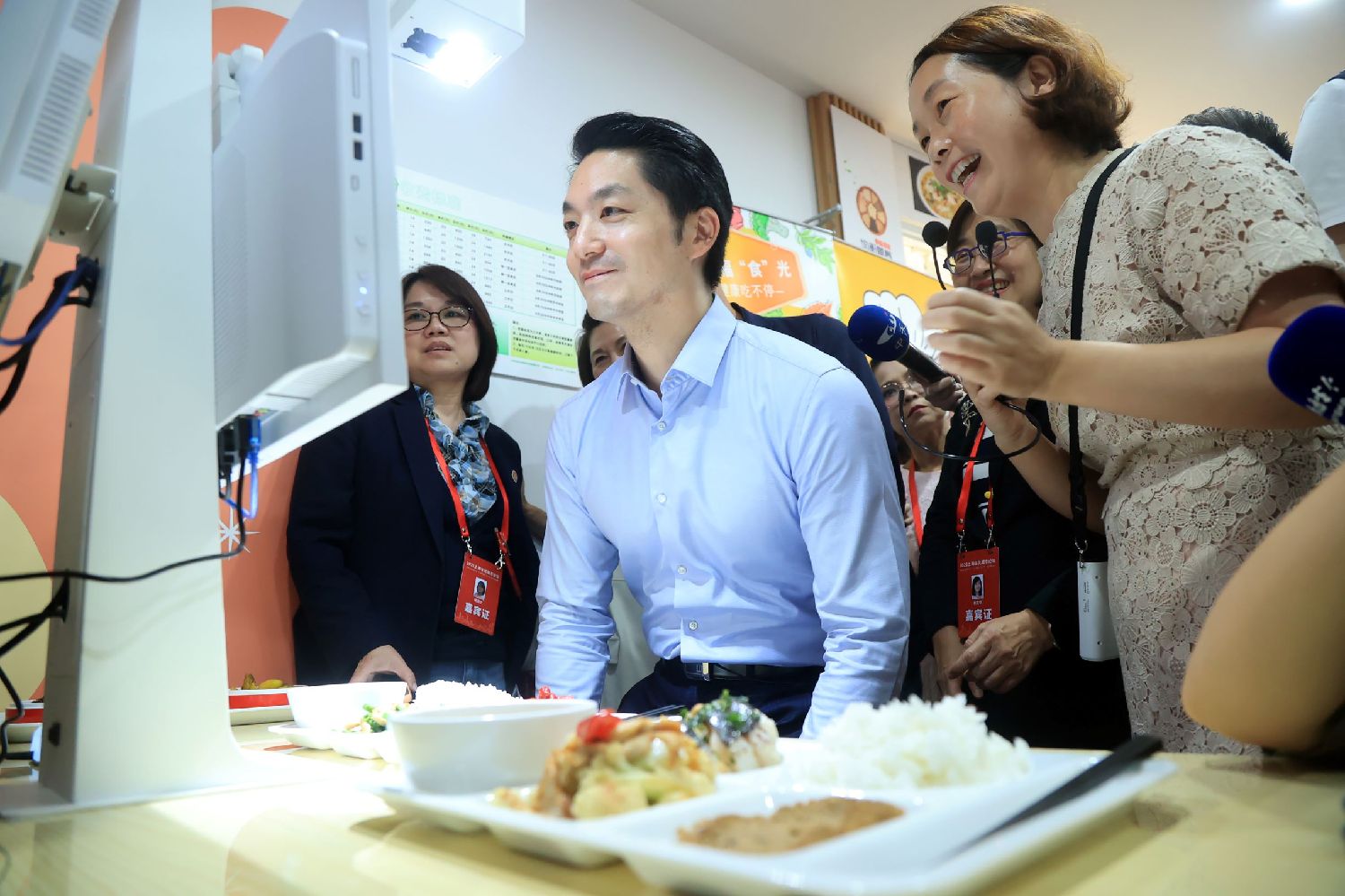 在宝宝屋和长者运动健康之家,蒋万安说:“台北也有临时托育,我太太最近常常使用,因为我的孩子很小。”在长者食堂,蒋万安还体验了人脸识别买单。