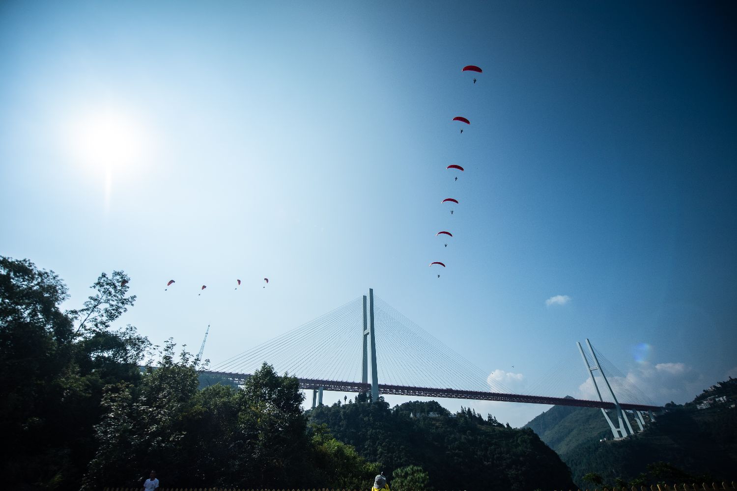 9月7日,来自荷兰的福克·韦夫从北盘江大桥上起跳翱翔。(新华社)