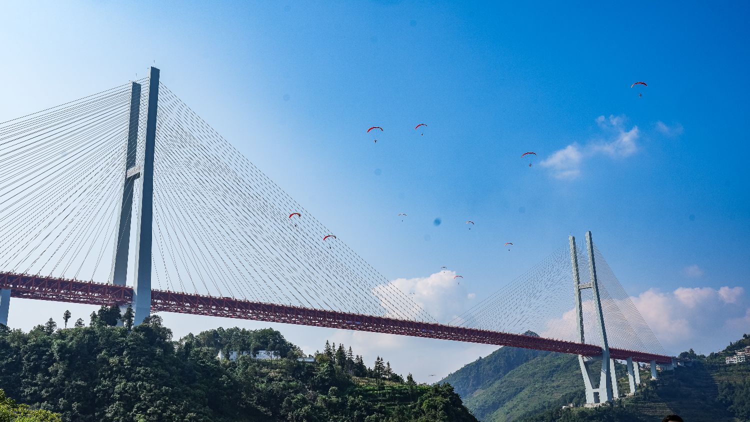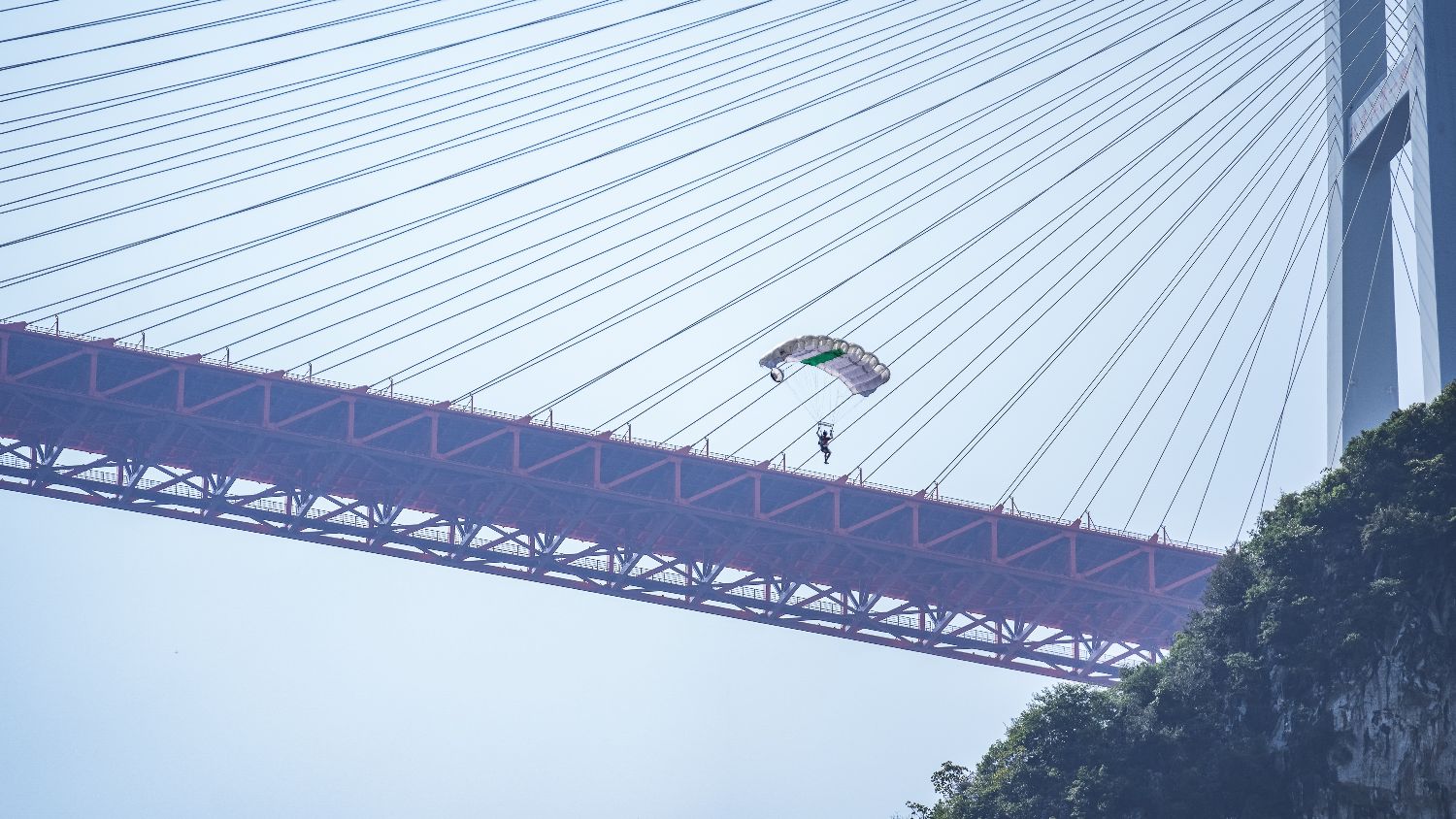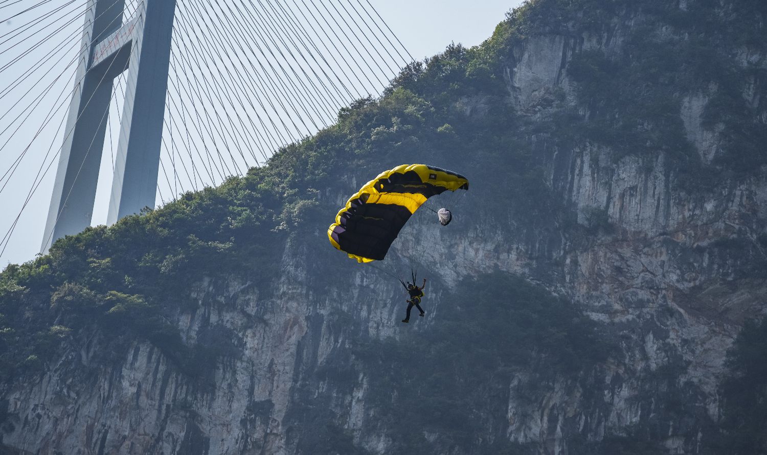 2023国际高桥极限运动邀请赛7日在贵州省六盘水市北盘江大桥附近结束。为期两天的比赛吸引了来自捷克、意大利、荷兰、美国、法国、加拿大等11个国家与地区的25名运动员参与。北盘江大桥是横跨在贵州和云南两省深山峡谷间的特大桥,全长1341.4米,桥面至江面垂直距离为565.4米,相当于200层楼高,被吉尼斯认证为“世界最高桥”。图为9月7日,来自以色列的沙洛姆在高山峡谷间翱翔。(新华社)