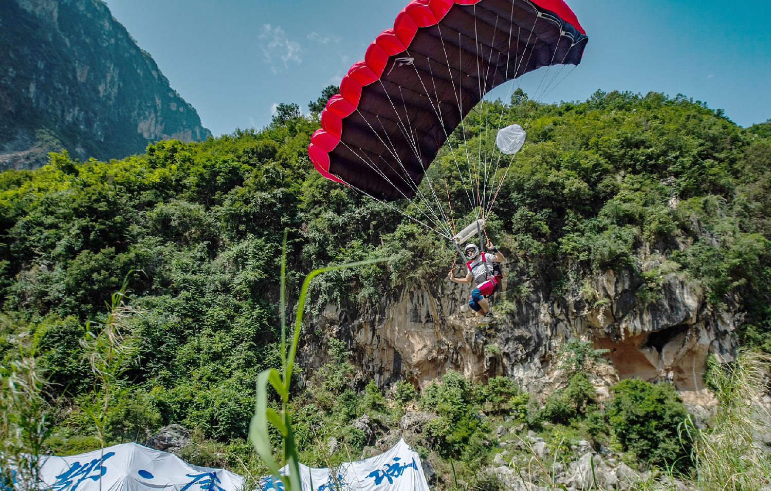 9月6日,运动员在高山峡谷之间翱翔(无人机照片)。(新华社)
