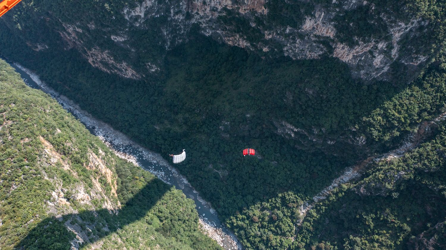 9月6日,运动员从北盘江大桥上一跃而下(无人机照片)。(新华社)