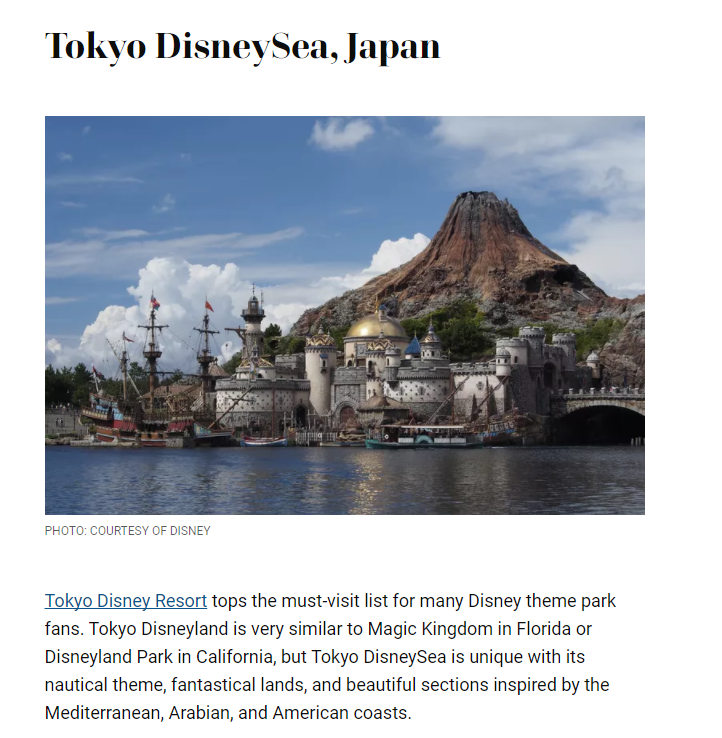 图为东京迪士尼海洋乐园及其上榜理由。(图/Travel&Leisure网站截图)