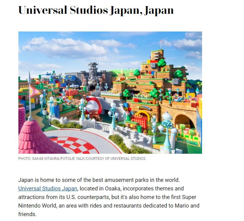 图为日本大阪环球影城及其上榜理由。(图/Travel&Leisure网站截图)