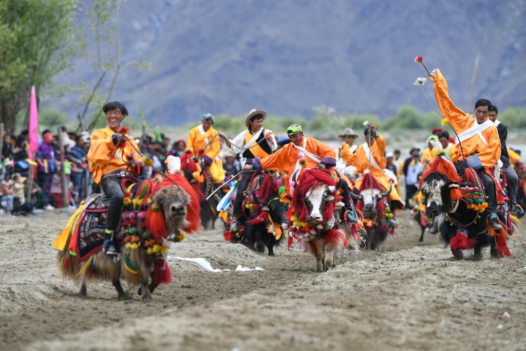 7月18日,西藏自治区拉萨市曲水县达嘎乡其奴村民众盛装欢度“望果节”。“望果节”民俗已有1500多年的历史,是国家级非物质文化遗产。图为骑手进行赛牦牛。(图/中新社)