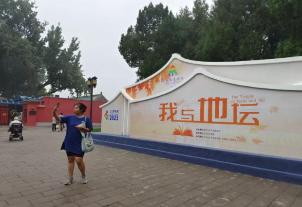 图为9月8日,“我与地坛”北京书市上,市民在背景板前打卡拍照。(图/北京《新京报》)