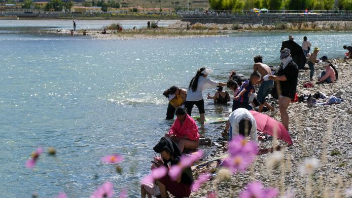 9月10日是藏历七月二十六,恰逢周末,西藏民众迎来传统沐浴节第二天。拉萨河畔格桑花丛中传出阵阵嬉笑打闹声,不少藏族家庭举家在河畔或梳洗、游泳、跳水、日光浴,或是在河畔一边闲话,一边煮着甜茶、牦牛肉等,享受惬意的沐浴节时光。