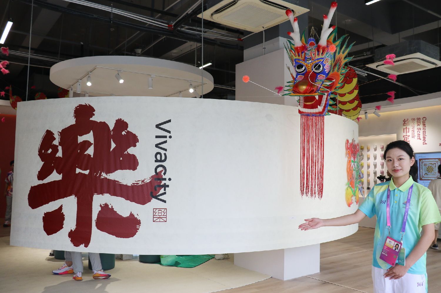 9月12日,杭州亚运村运动员村文化小屋内,志愿者展示小屋上空的“中华龙”风筝。(图/中新社)