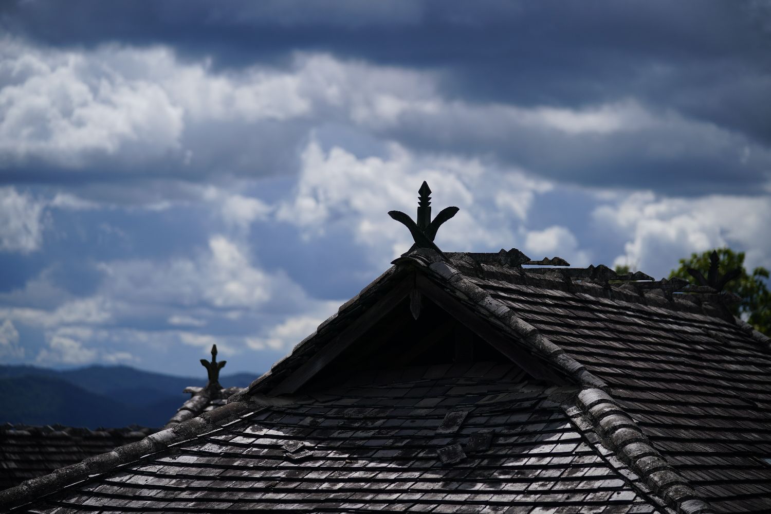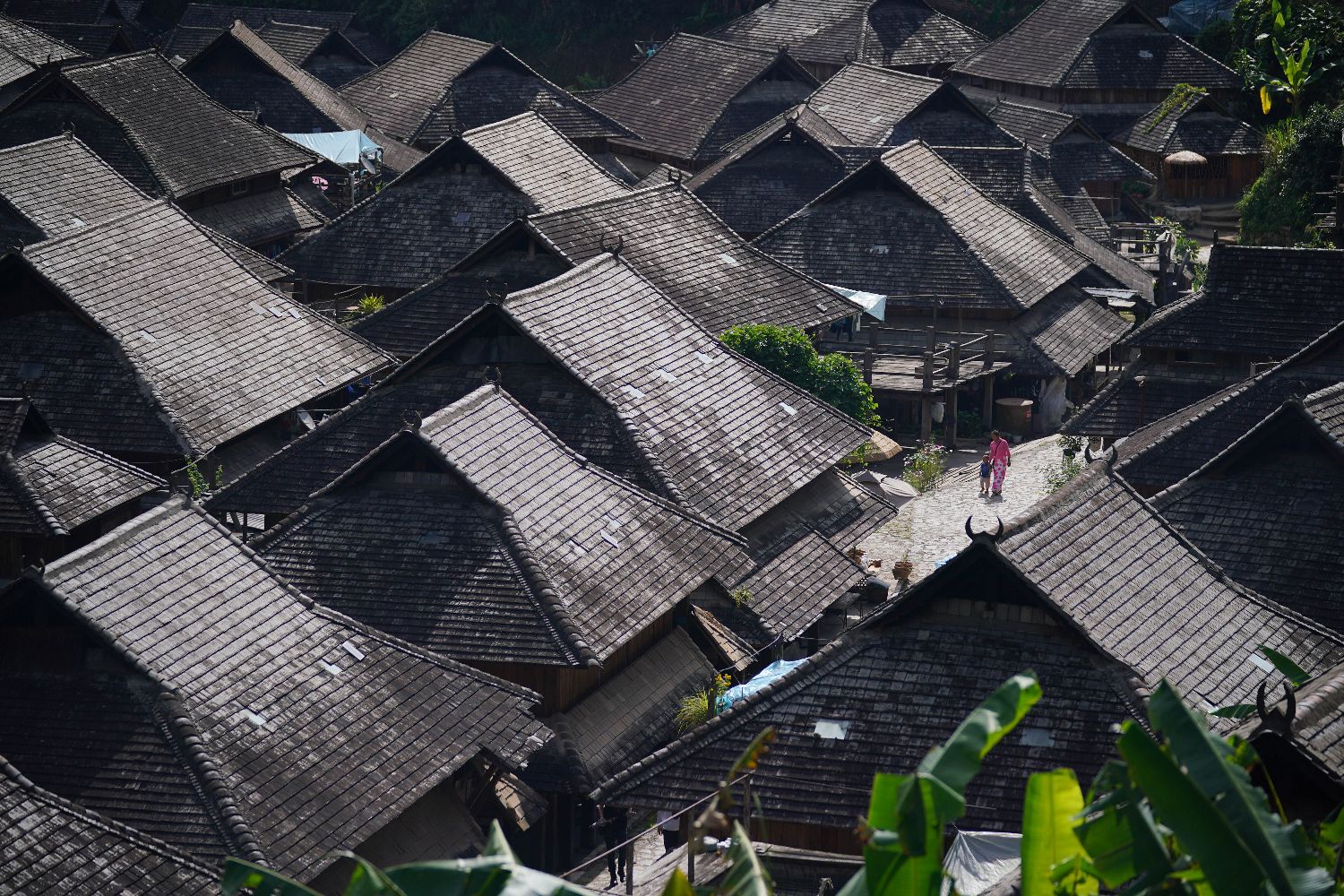 “林-茶-村”,这三大要素组成了完整的普洱景迈山古茶林文化景观,通过以古茶林为核心的生产、生活和生态用地的合理分配和可持续利用,创造了茶在森林中、村在茶林中、耕地和其他生产活动在茶林外的智慧山地人居环境,是可持续发展的山地森林农业文化景观杰出代表。图为9个古村寨之一的翁基古寨家家户户屋檐上都有象征茶树“一芽两叶”的图腾。(中新社)