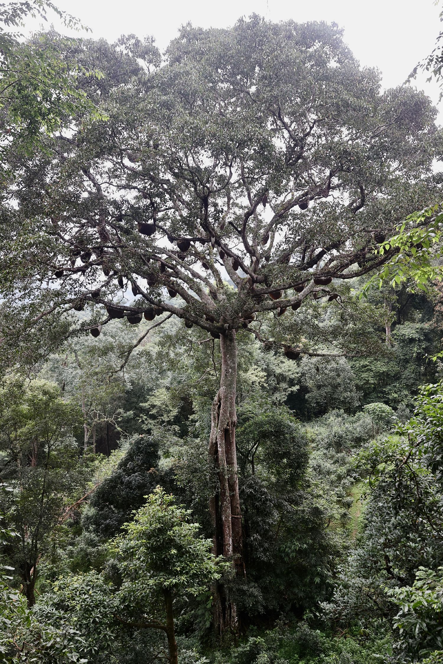 这棵树坐落于景迈山古茶林中,因其树干布满七十余个野蜂蜂巢,并被当地人视为“蜂神树”,受到了严格的保护和尊崇。这一棵树就是一个小的生态系统,承载了景迈山茶林共生、万物一体的生态智慧。(中新社)
