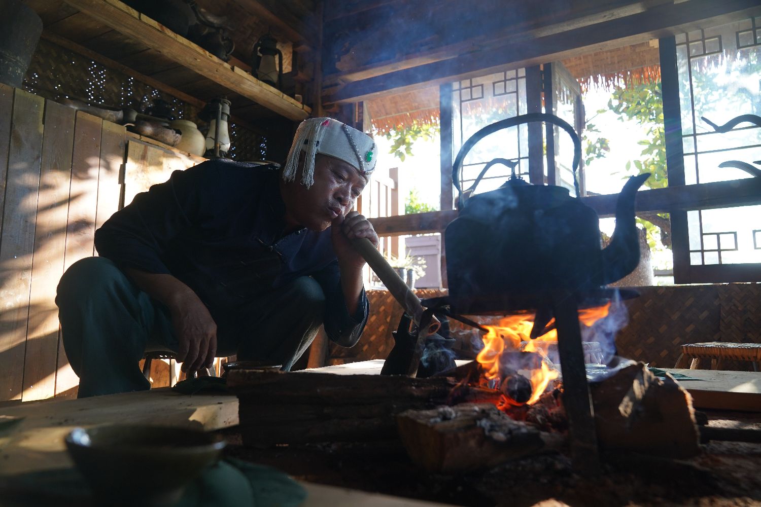 景迈山传统手工制茶技艺市级传承人南康坐在火塘边,展示布朗族烤茶的制作过程。(中新社)