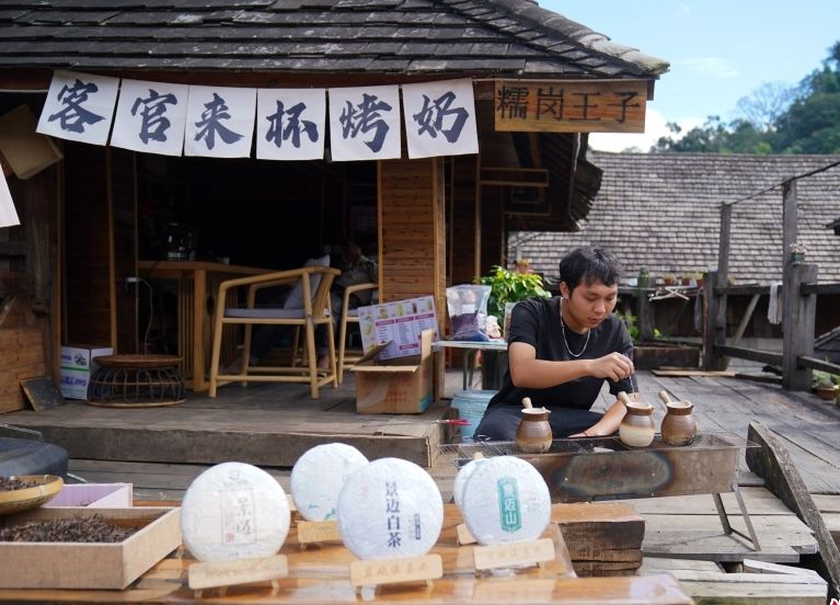 糯干古寨,一名傣族年轻人在店门口给顾客制作烤奶茶。(中新社)