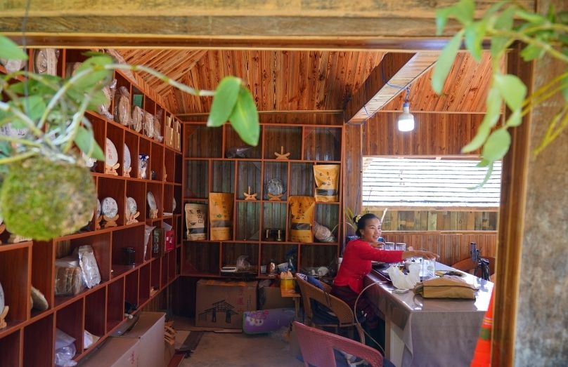 糯干古寨中,一名村民在自家茶室中直播卖茶。(中新社)