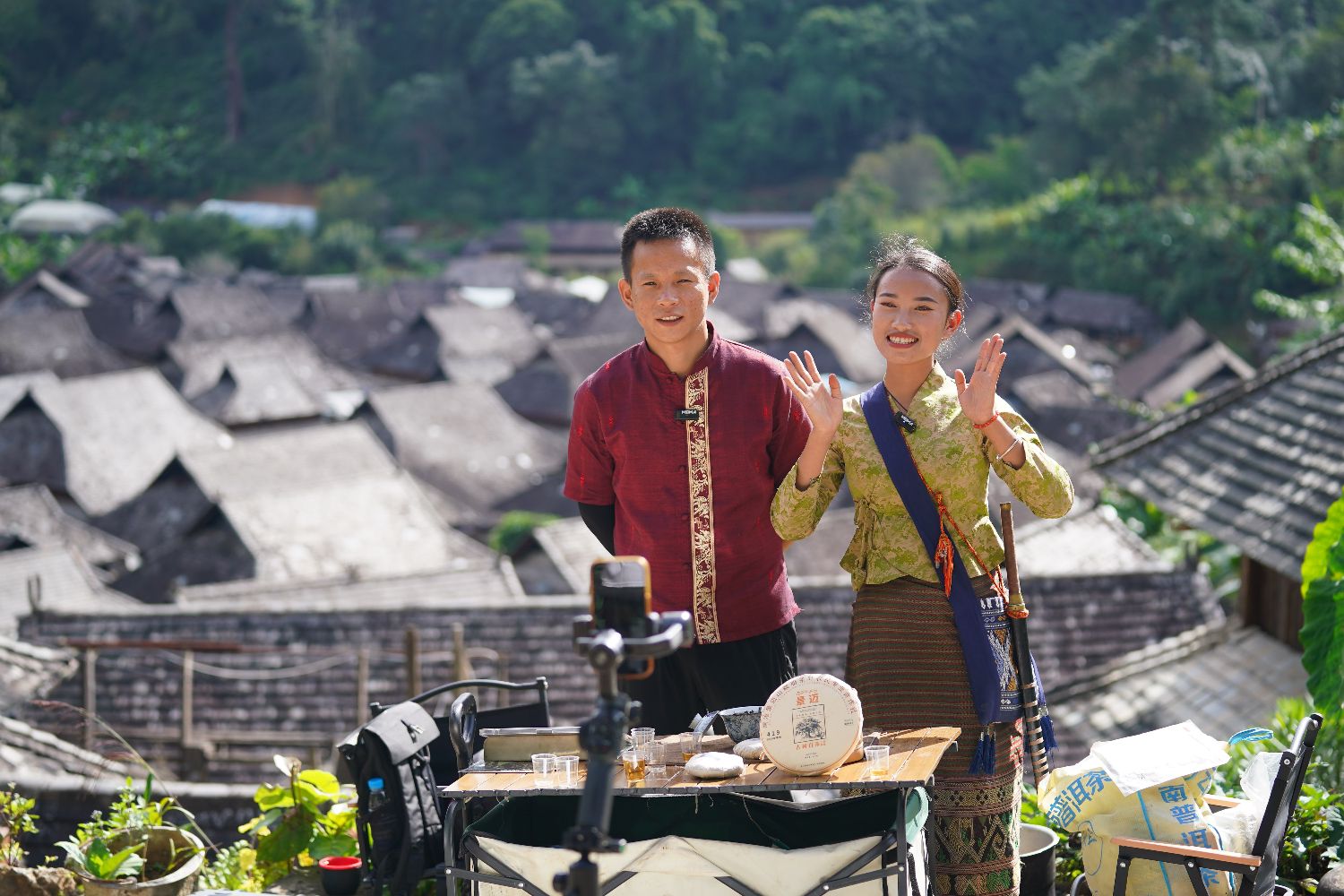 傣族姑娘仙金(右)和男朋友丁志雄(左)在糯干古寨进行网络直播,向网民推介景迈山和自家出产的茶叶。(中新社)