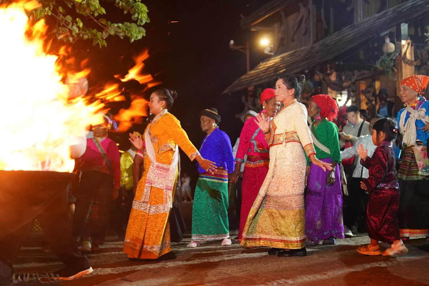 “普洱景迈山古茶林文化景观”列入《世界遗产名录》后,民众在景迈山翁基古寨载歌载舞庆祝。(中新社)