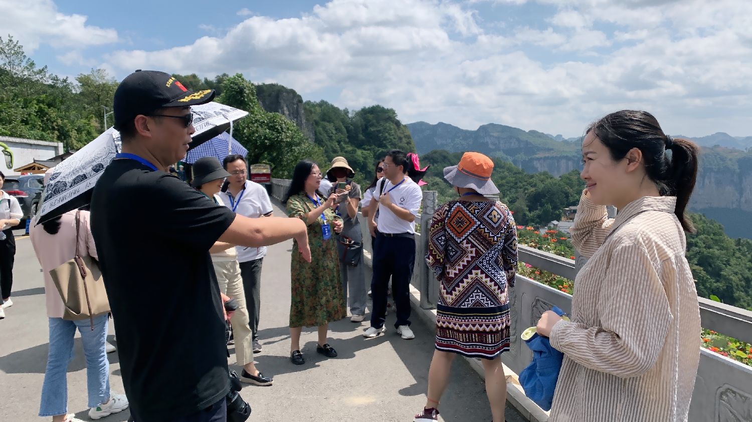 2023“华文媒体侨行贵州”活动19日在贵阳启动,吸引了20个国家的20位华文媒体代表参加,体验贵州声音和贵州故事。图为黔西市化屋村观景台上,化屋村村支书为海外华媒代表讲解乌江源百里画廊。(凉子 摄)